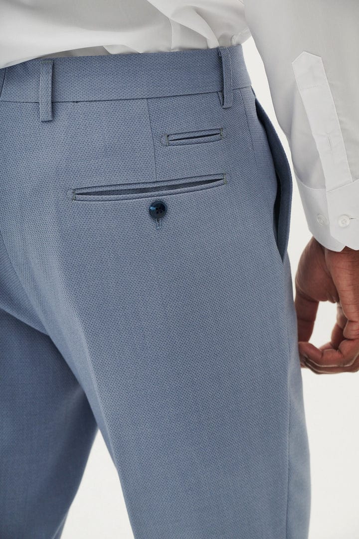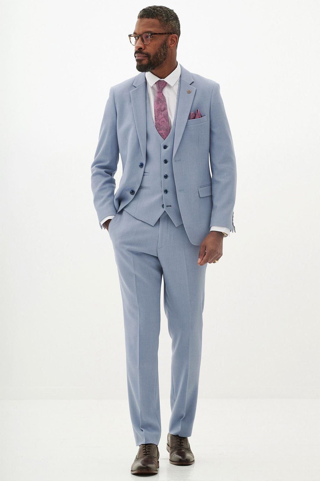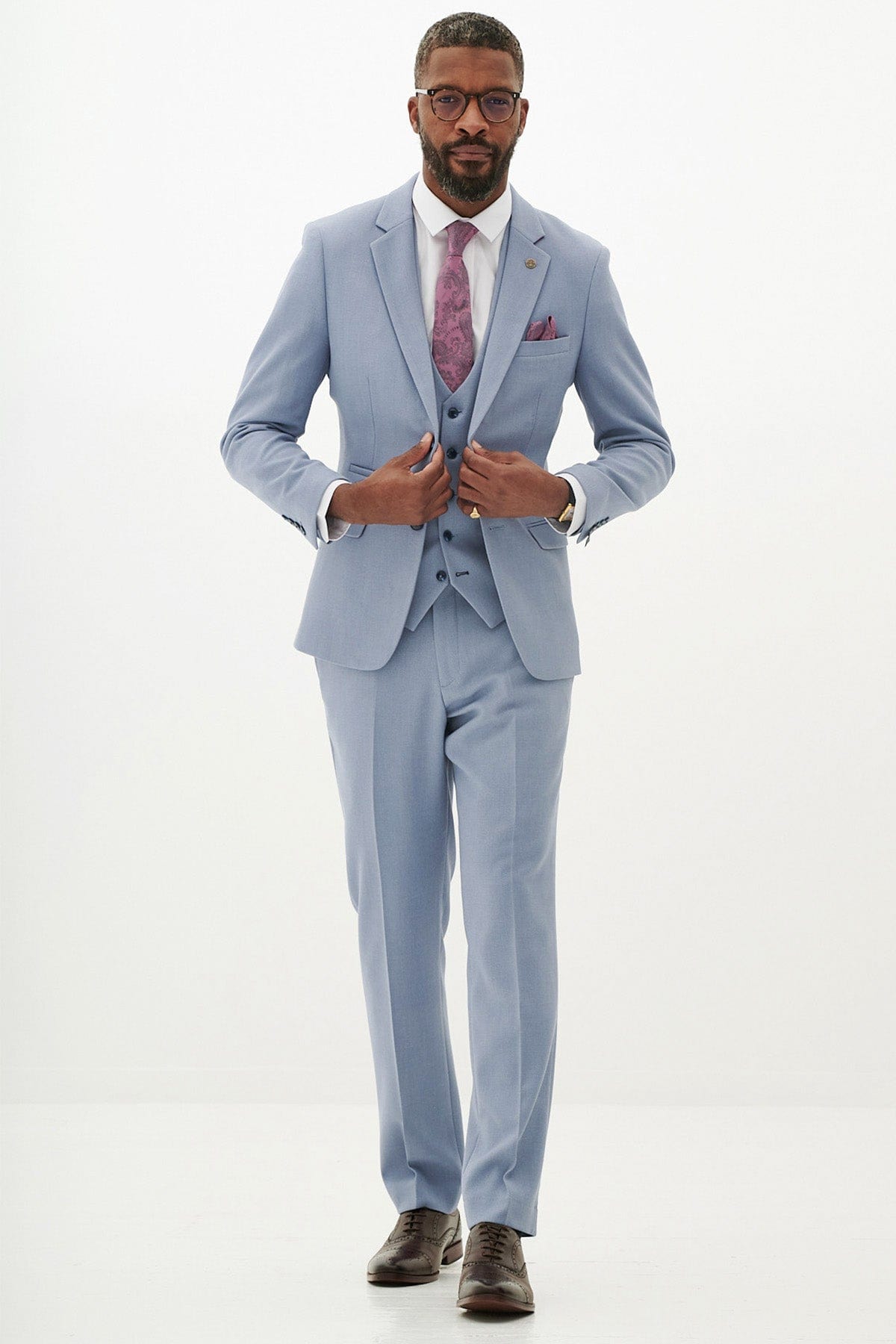 Dieser blaue dreiteilige Herrenanzug ist eine stilvolle und vielseitige Wahl für Hochzeiten und verschiedene formelle Anlässe. Er besteht aus einem bequemen Materialmix aus 35 % Viskose und 65 % Polyester und besteht aus einem Blazer mit Revers, einer passenden Weste und einer Hose. Der Blazer ist einreihig mit zwei Knöpfen, seitlichen Schlitzen und mehreren praktischen Taschen ausgestattet. Die Weste mit V-Ausschnitt verfügt über einen 5-Knopf-Verschluss mit einem elastischen Metallband auf der Rückseite für eine optimale Passform. Die Hose hat einen Reißverschluss und vier praktische Taschen. Pflegeleicht in der Maschine oder von Hand waschbar.
