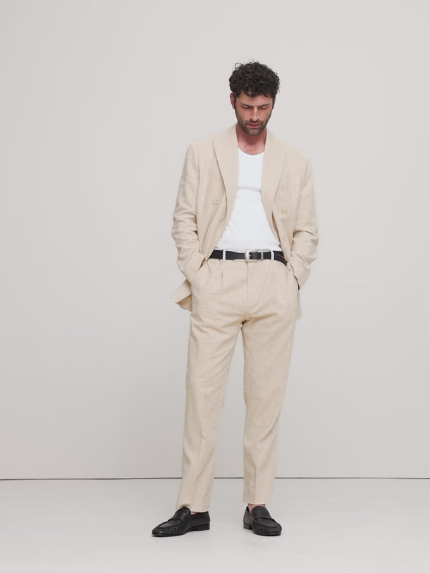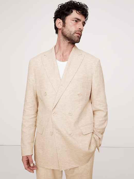 Dieser zweiteilige beige Sommer-Freizeitanzug für Herren besteht aus 40 % Baumwolle und 60 % Leinen für Atmungsaktivität und Tragekomfort. Der zweireihige Blazer hat ein spitzes Revers, sechs Knöpfe vorne, Seitenschlitze und einen klassischen Schnitt mit zwei aufgesetzten Taschen, einer Leistentasche und einer Innentasche. Ärmelschlitze mit vier Manschettenknöpfen und ein durchgehendes Futter verleihen ihm einen edlen Touch. Die passende Hose hat einen Reißverschluss, zwei Gesäßtaschen und zwei Nahttaschen. Pflegeleicht in der Maschine oder Handwäsche – ideal für Eleganz bei warmem Wetter mit einem entspannten und dennoch eleganten Look.