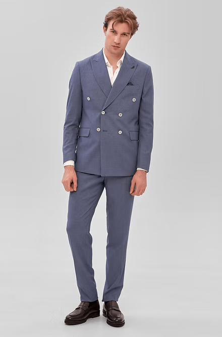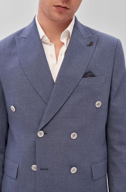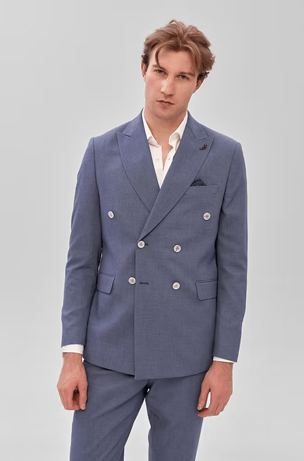 Dieser zweiteilige, blaugrüne Herrenanzug besteht aus einem stilvollen, zweireihigen Blazer mit steigendem Revers und Seitenschlitz aus einer bequemen Mischung aus 35 % Viskose und 65 % Polyester. Das Sakko hat 6 Knöpfe vorne, 2 aufgesetzte Taschen, eine Leistentasche, eine Innentasche und geschlitzte Ärmel mit 4 Manschettenknöpfen. Vollständig gefüttert für mehr Struktur und Komfort. Die passende Hose hat einen Reißverschluss, 2 echte Gesäßtaschen und 2 echte Nahttaschen. Maschinenwäsche oder Handwäsche empfohlen – perfekt für einen eleganten und modischen Look.