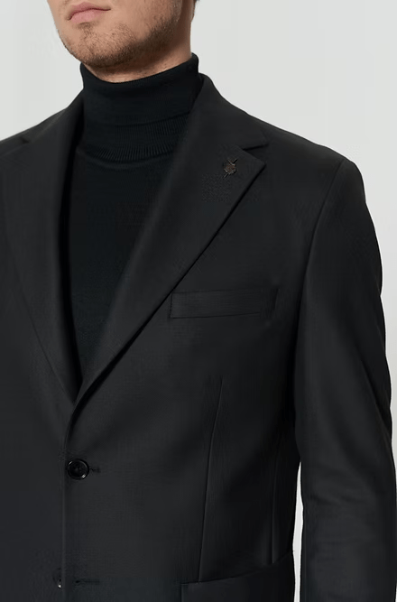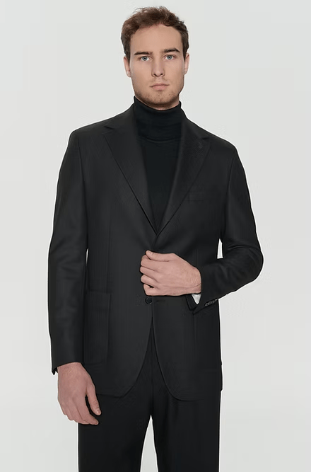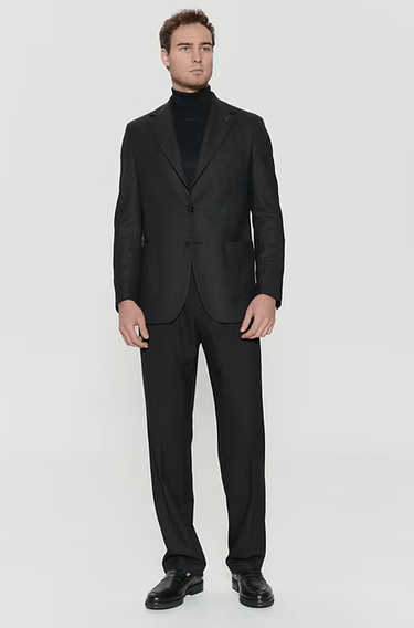 Dieser zweiteilige schwarze Herrenanzug vereint Business-Style mit vielseitiger Tragbarkeit. Er besteht aus einem bequemen und strapazierfähigen Mischgewebe aus 35 % Viskose und 65 % Polyester und verfügt über ein klassisches Revers, einen einreihigen Zwei-Knopf-Verschluss und seitliche Schlitze für einen eleganten Look und atmungsaktiven Tragekomfort. Der Blazer verfügt über Patten-, Leisten-, Quer- und Innentaschen, während die passende Hose mit Reißverschluss und vier echten Taschen ausgestattet ist. Vollständig gefüttert und pflegeleicht durch Maschinen- oder Handwäsche eignet sich dieser Anzug sowohl für den beruflichen als auch für den Freizeitbereich.