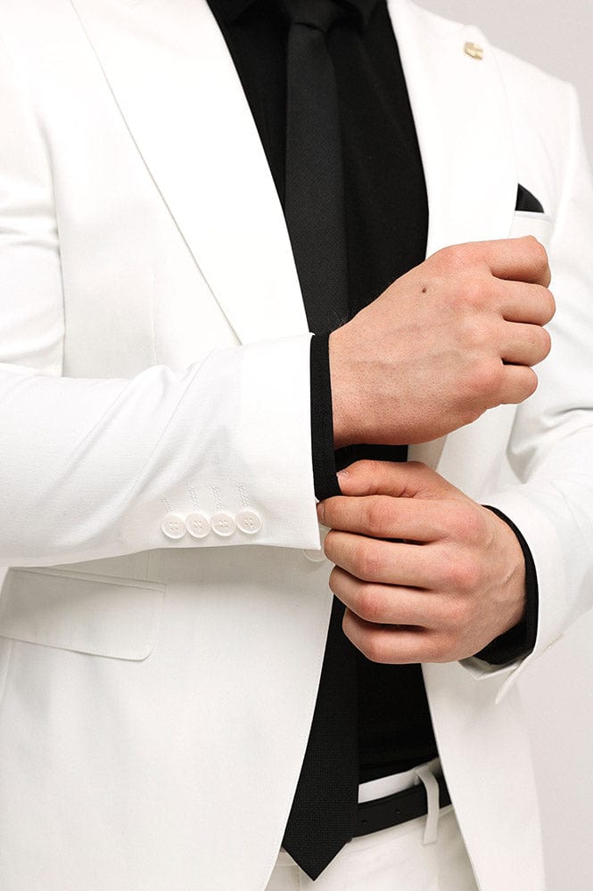 Dieser zweiteilige weiße Smoking für Herren mit spitzem Revers ist ideal für Hochzeiten, formelle Anlässe und andere besondere Anlässe. Er besteht aus einer bequemen und strapazierfähigen Mischung aus 35 % Viskose und 65 % Polyester und umfasst einen vollständig gefütterten Blazer mit Einknopfverschluss, Mittelschlitz und mehreren praktischen Taschen. Die passende Hose verfügt über einen Reißverschluss und vier praktische Taschen. Dieser stilvolle und praktische Anzug ist maschinen- oder handwaschbar. Farb- und Größenanpassungen sind auf Anfrage möglich.
