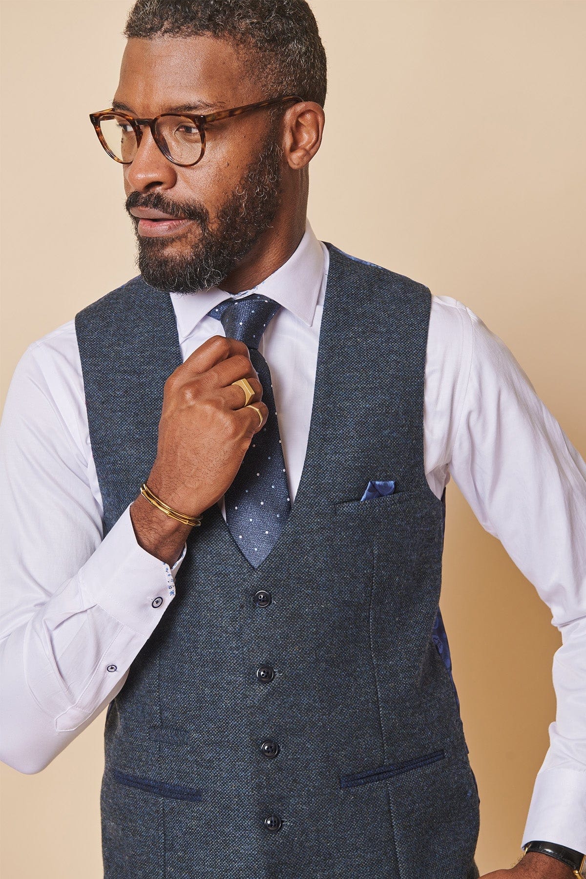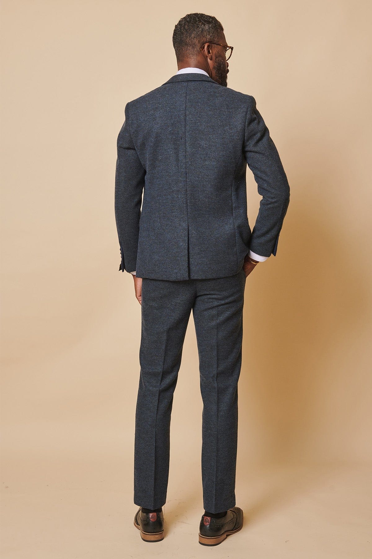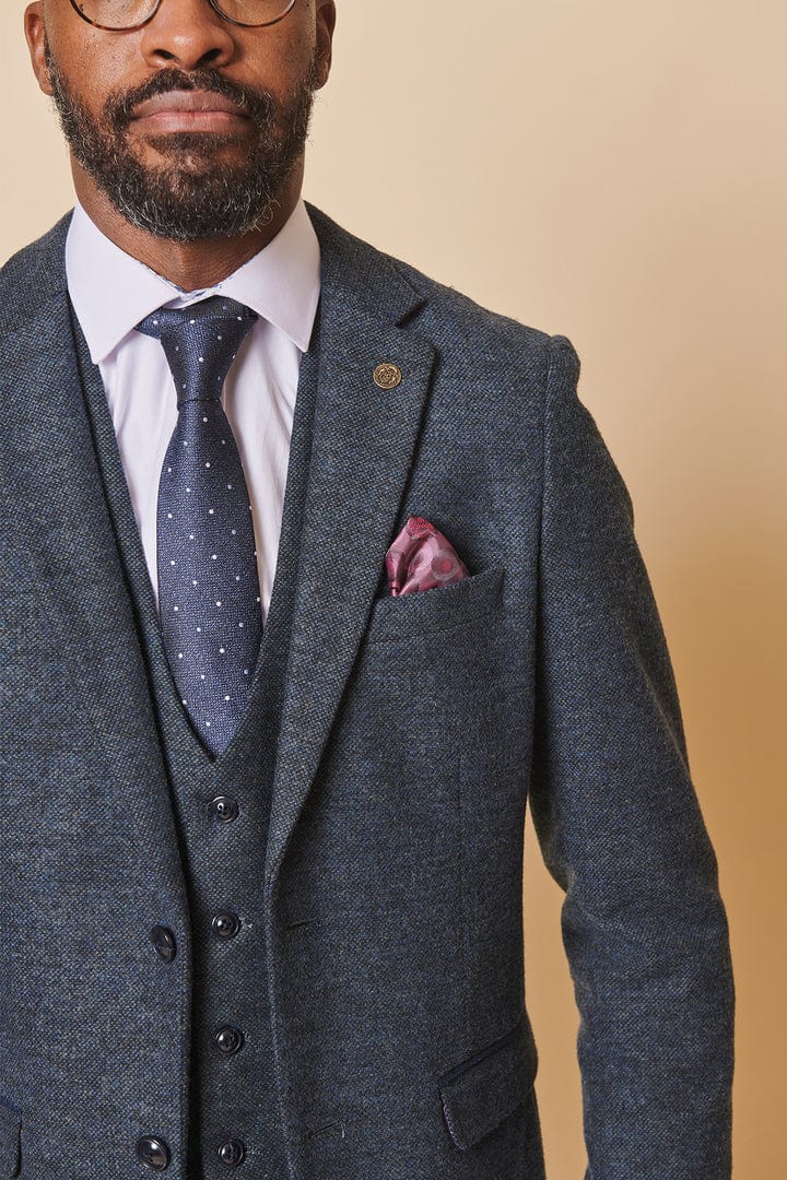 Ein Herren-Dreiteil-Formalset in Navy-Tweed-Wolle-Herringbone, gefertigt aus 20% Wolle und 80% Polyester, bestehend aus Blazer, Weste und Hose. Der Blazer verfügt über Notchlapel, Mittelrippe, einreihigen Zwei-Knopf-Verschluss, zwei aufgesetzte Taschen, eine Reißverschluss-Tasche, zwei Innentaschen, Ärmelschlitze mit vier Manschettenknöpfen und vollständige Futterung. Die Weste präsentiert sich mit V-Ausschnitt, zwei echten Randsägtaschen, einem einreihigen Fünf-Knopf-Verschluss und einer metallischen elastischen Rückenverstellung. Die Hose ist mit Reißverschluss, zwei Hüfttaschen und zwei Nahttaschen ausgestattet und kann maschinell oder per Hand gewaschen werden.