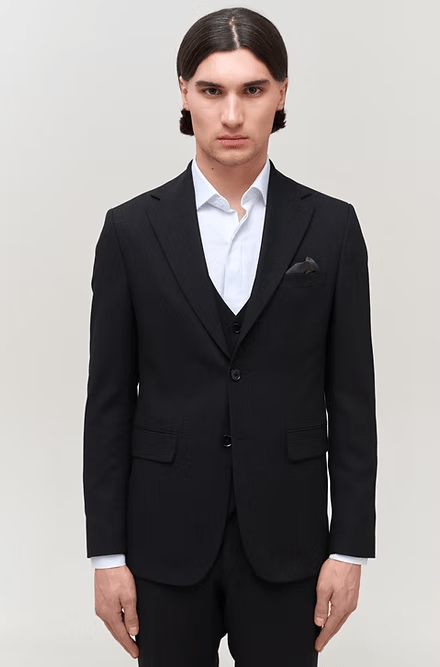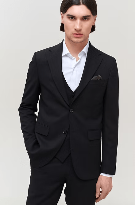 Dieser klassische schwarze dreiteilige Herrenanzug ist eine zeitlose Wahl für geschäftliche oder formelle Anlässe. Er besteht aus einem strapazierfähigen Materialmix aus 35 % Viskose und 65 % Polyester und besteht aus einem Blazer mit Revers, einer maßgeschneiderten Weste und der passenden Hose. Der Blazer hat eine einreihige Zwei-Knopf-Front, mehrere Taschen und seitliche Schlitze für Komfort und Bewegungsfreiheit. Die passende Weste hat einen markanten V-Ausschnitt, einen Fünf-Knopf-Verschluss und eine verstellbare Schnalle hinten für eine individuelle Passform. Die Hose komplettiert das Set mit Reißverschluss und vier Taschen. Ein vielseitiger, maschinenwaschbarer Anzug, ideal für viele Anlässe.