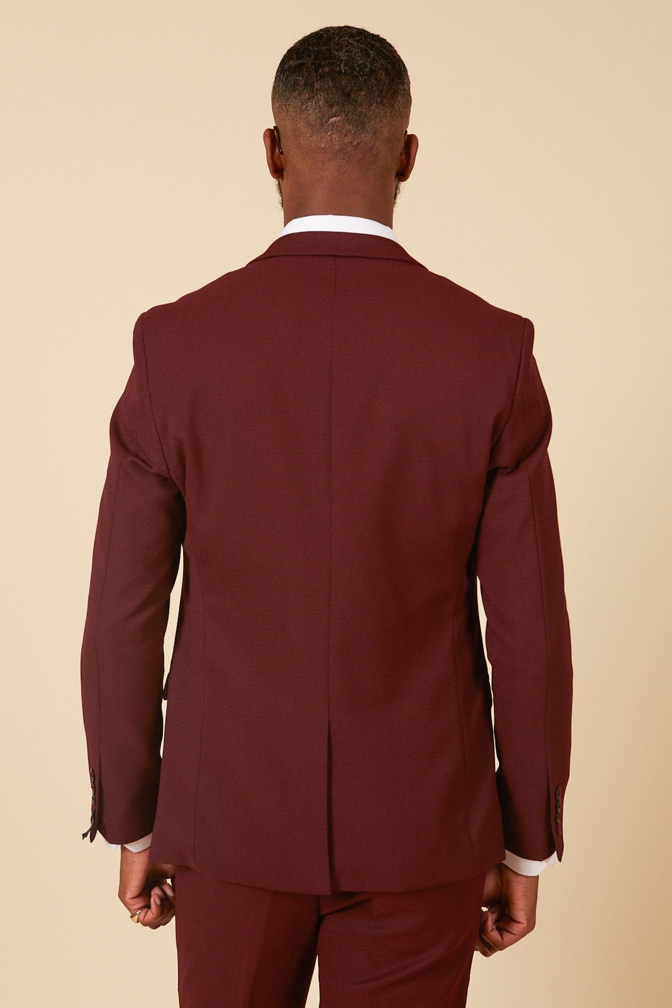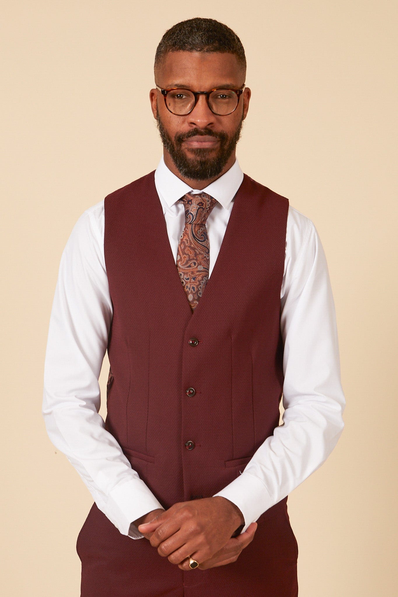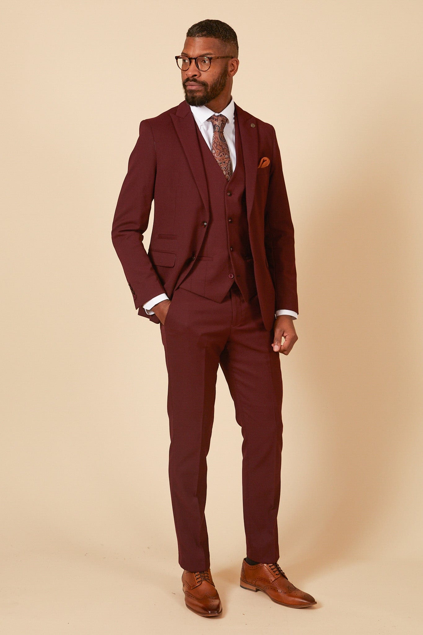 Männeranzug Mode Freizeit Weinrot mit Notch-Kragen doppelreihig 3-teiliger Karomuster-Suit