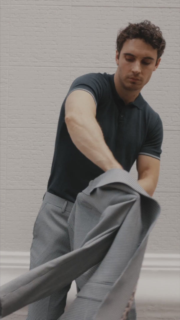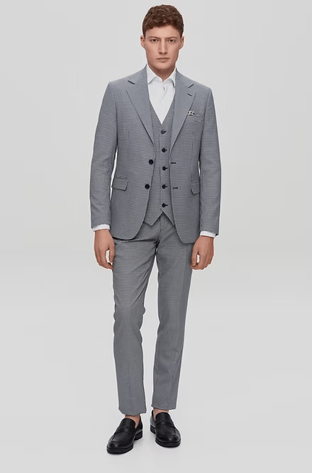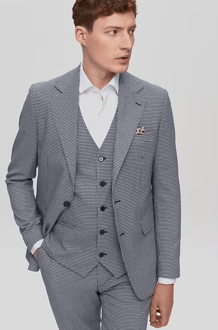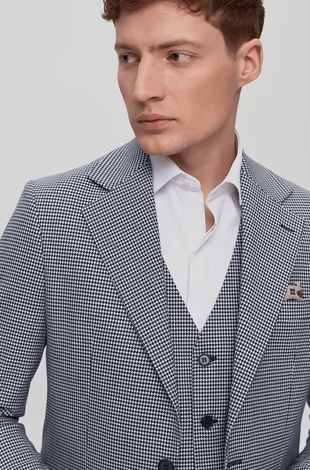 Dies ist ein dreiteiliges Anzugset aus einer Mischung aus 20 % Wolle und 80 % Polyester in einem Karo-/Tweedmuster. Es besteht aus Blazer, Weste und Hose. Der Blazer hat ein fallendes Revers, einen Mittelschlitz und Doppelknöpfe sowie 2 echte Pattentaschen, 1 echte Leistentasche, 1 echte Innentasche und Ärmelschlitze mit 4 Manschettenknöpfen; er ist komplett gefüttert. Die Weste hat einen V-Ausschnitt, 2 echte Leistentaschen, ist einreihig mit 3 Knöpfen und hat hinten eine elastische Metallschnalle zur Verstellung. Die Hose hat einen Reißverschluss, 2 echte Gesäßtaschen und 2 echte Nahttaschen. Der Anzug kann in der Maschine oder von Hand gewaschen werden. Farb- oder Größenanpassungen sind möglich und sollten bei der Bestellung angegeben werden, sodass er für formelle oder halbformelle Anlässe geeignet ist.